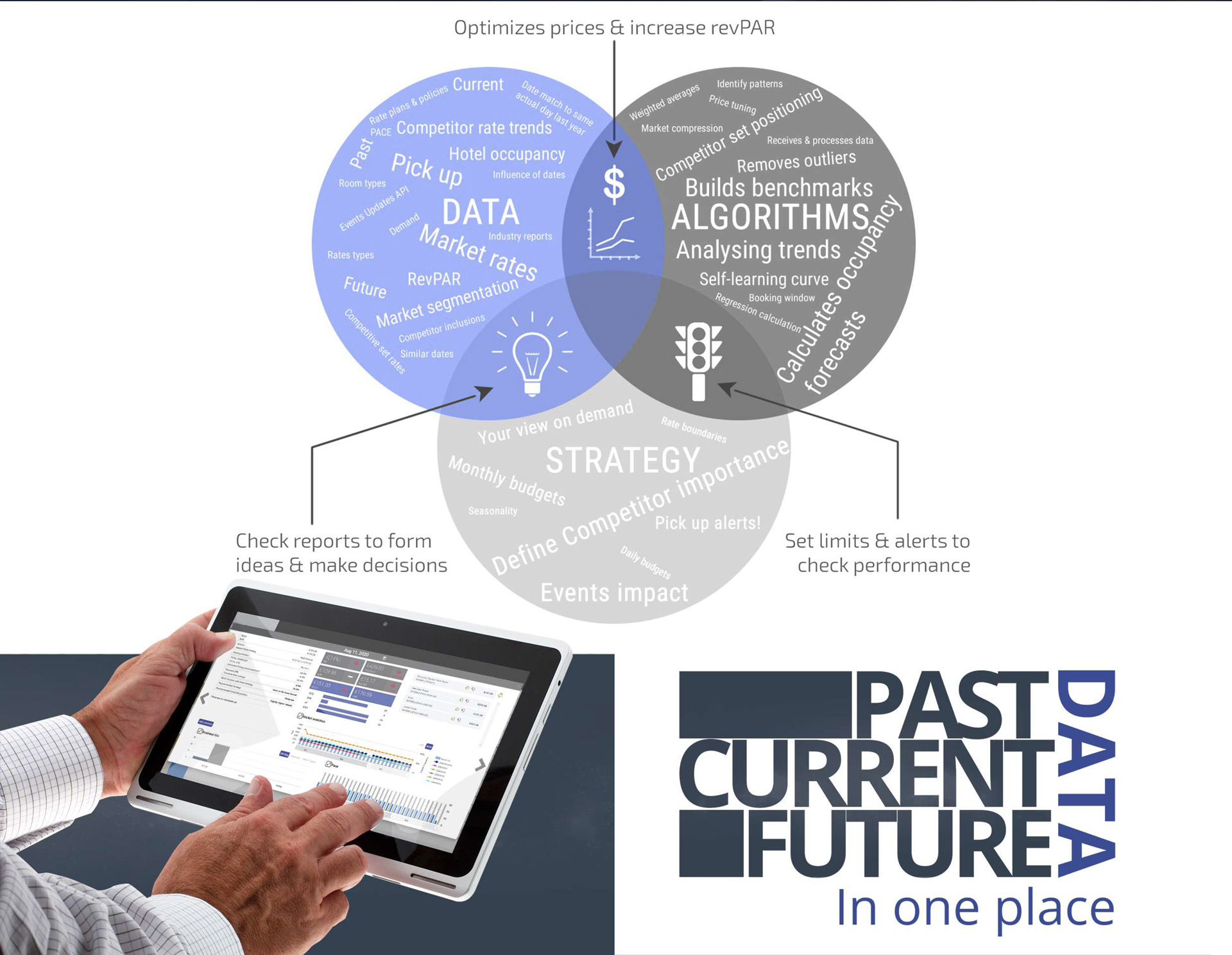 Because brilliant revenue management takes up so much time and is a very manual process – fragmented data from PMS, rate shoppers, channel managers and revenue optimizers, offline/online, sometimes past or current, not often future – this picture is incomplete, disconnected and not aggregated.